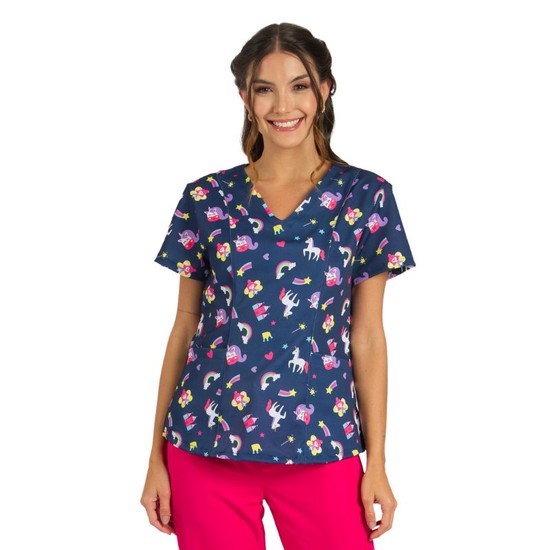 A Blusa Scrub Feminina Mundo Encantado é a escolha perfeita para quem deseja unir conforto, leveza e um toque de magia no ambiente de trabalho. Com uma estampa encantadora de unicórnios, fadinhas, castelos, arco-íris e estrelas, ela traz alegria e estilo para os seus atendimentos diários.