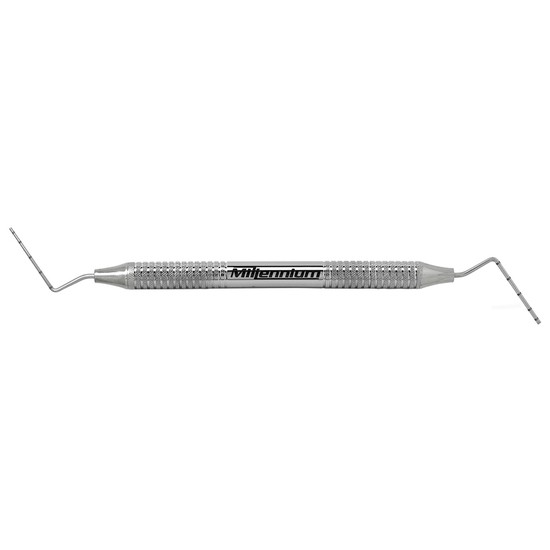 Instrumento endodôntico com duas pontas milimetradas que proporciona controle preciso de profundidade e versatilidade para condensação lateral e vertical, favorecendo selamento previsível dos canais radiculares com ergonomia e durabilidade.