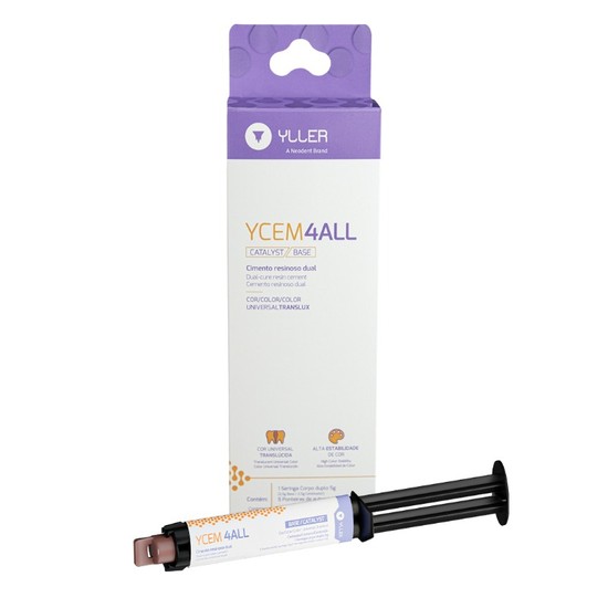 YCEM 4ALL é um agente de cimentação adesiva permanente e de cura dual, com elevada estabilidade de cor. Formulado com pasta base e catalisadora totalmente livres de aminas (responsáveis pelo amarelamento ao longo do tempo), é indicado para uma ampla variedade de situações clínicas, inclusive as de alta exigência estética.