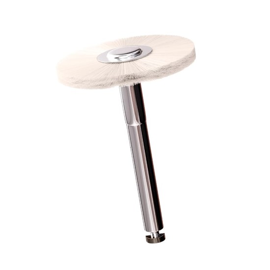 Escova de polimento com cerdas naturais macias e baixa abrasividade, indicada para acabamento homogêneo e brilho, com controle de rotação até 10.000 rpm e possibilidade de esterilização em autoclave para maior biossegurança e reuso.