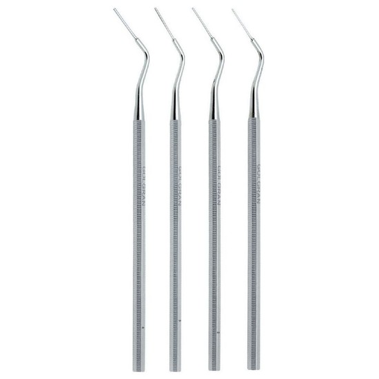 Cada calcador possui ponta longa e fina em apenas um dos lados. O cabo oitavado proporciona boa empunhadura, minimizando rotação indesejada na mão e na bancada de trabalho, contribuindo para movimentos precisos na condensação vertical.