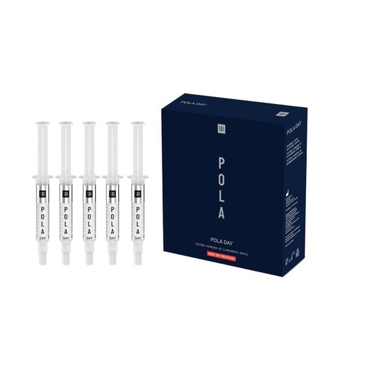 Pola Day: 3.0-9.5% Peróxido de hidrogênio, < 47% aditivos, 30% glicerol, 20% água, 0.1% aromatizantes.