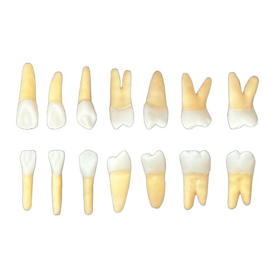 Conjunto de dentes endodônticos em resina radiopaca de alta dureza, com conduto que simula a polpa dental, oferecendo anatomia fiel e realista para simulações clínicas e treinamento próximo à prática profissional.