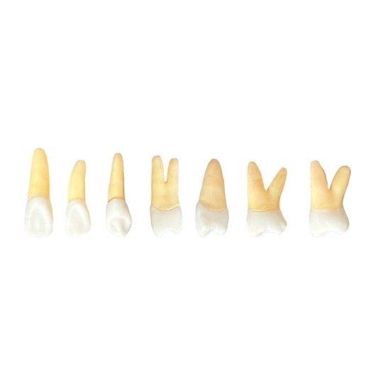 Kit de dentes endodônticos confeccionados em resina radiopaca de alta dureza, com conduto que simula a polpa dental. Projetado para simulações clínicas realistas, oferece treinamento próximo à prática profissional com visualização radiográfica nítida.
