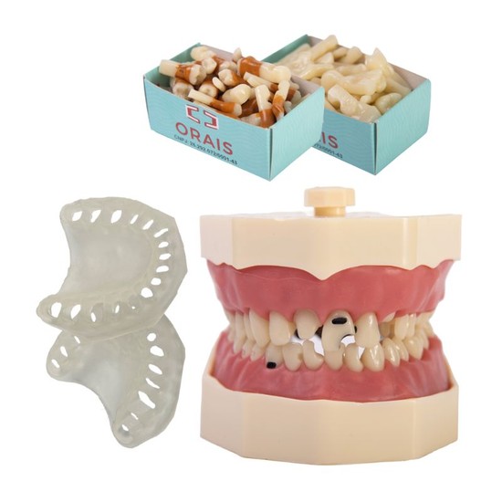 Kit com 1 manequim de materiais dentários 217 (dentes estéticos com preparos), 1 jogo de dente de periodontia, 1 jogo de dente de dentística (estético), 1 par de gengivas transparentes.