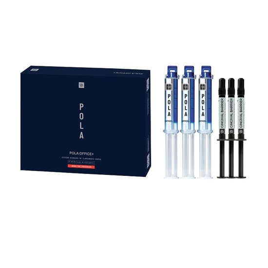 Peróxido de Hidrogênio. Kit com 3 seringas de Pola Office 2,8 ml, 3 seringas de barreira gengival de 1g e acessórios.