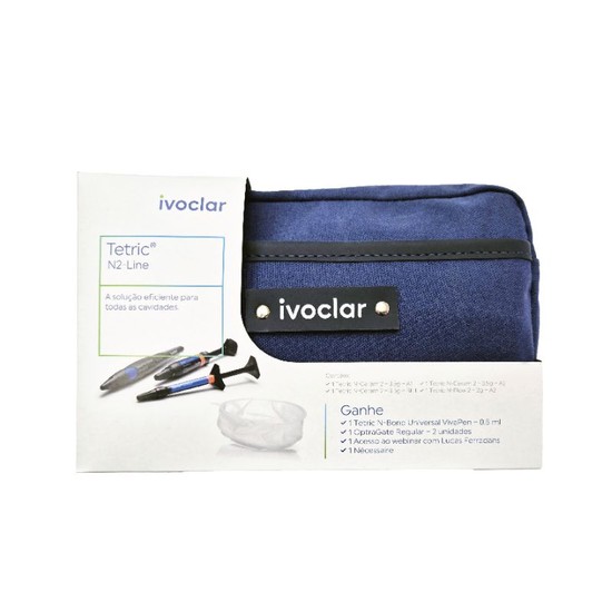Kit com 3 seringas Tetric N-Ceram 2 de 3,5g (A1, A2 e BL L), 1 Tetric N-Flow 2 A2 de 2g, 1 Tetric N-Bond Universal VivaPen 0,5ml, 1 acesso ao webinar com Lucas Ferradans , 1 nécessaire e 2 Afastador Labial OptraGate (1 Regular e 1 pequeno).