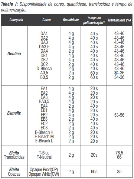 - Seleção de cores essenciais (esmalte, dentina e translúcida) para estratificações eficientes.