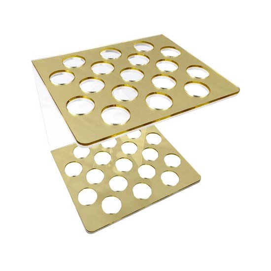 Suporte organizador de bancada com 17 cavidades para armazenar e separar resinas. Leve e prático, possui base estável e acabamento espelhado dourado, otimizando o espaço de trabalho com fácil higienização e visual sofisticado.