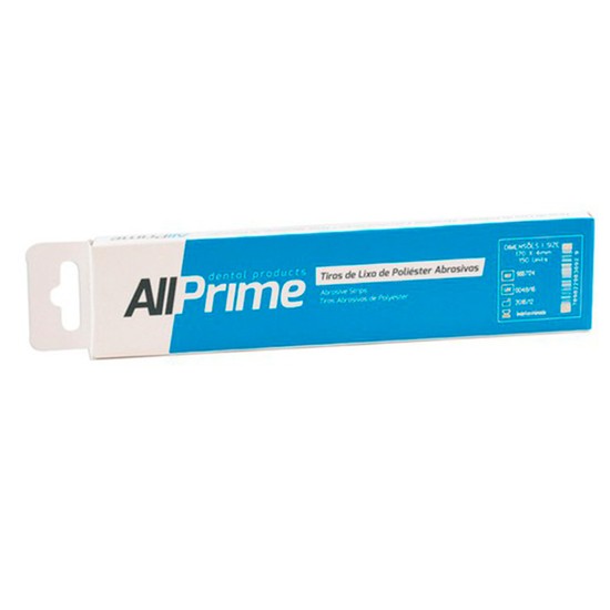 A tira de poliéster da marca AllPrime é uma lixa feita com diamantes naturais, indicada para a regularização em restaurações interproximais a base de resinas compostas, podendo ser usada em compósitos, acrílicos, ionômeros de cimento de vidro e amálgamas. Seu centro neutro facilita a introdução nas superfícies interproximais dos dentes.